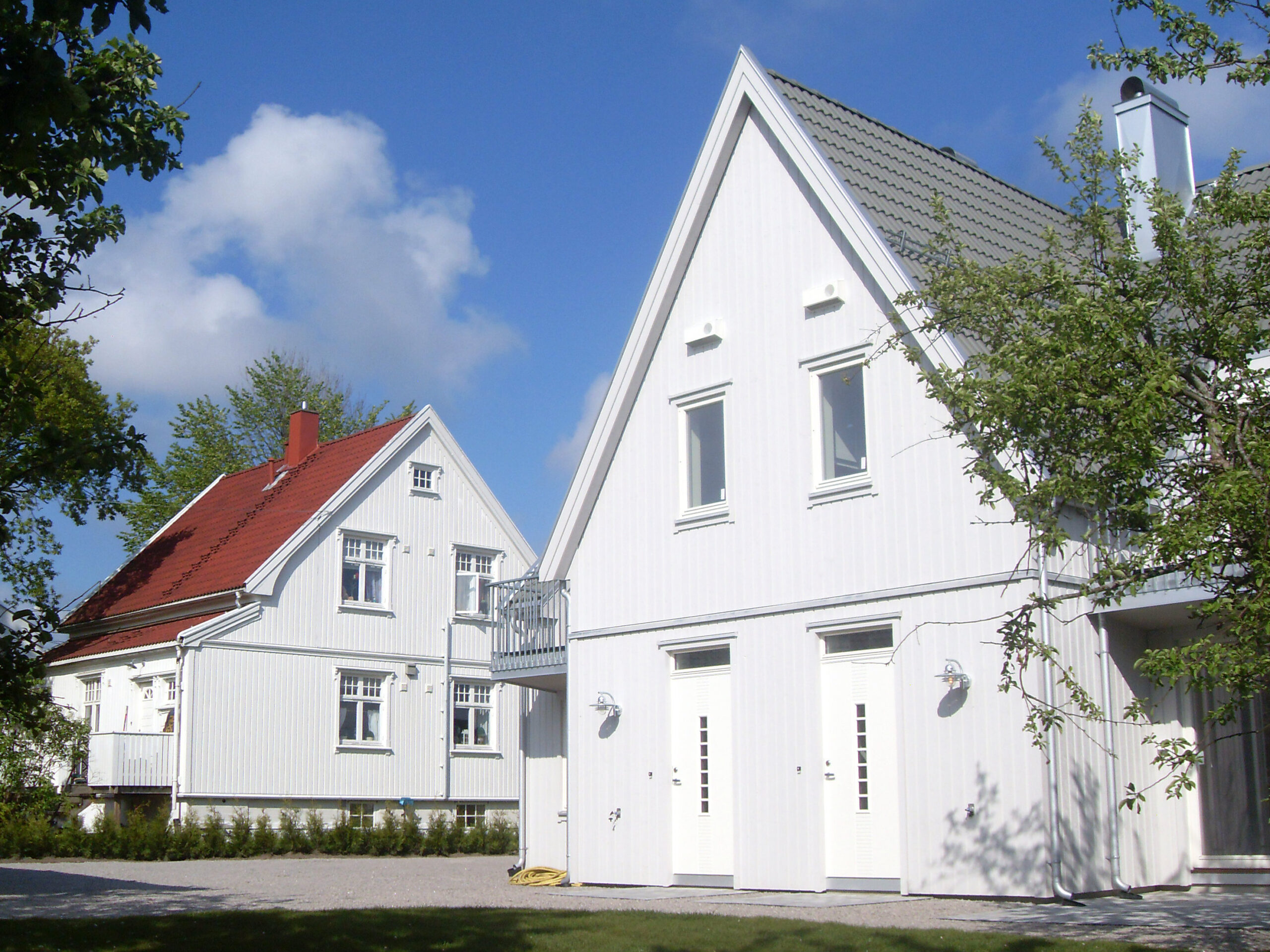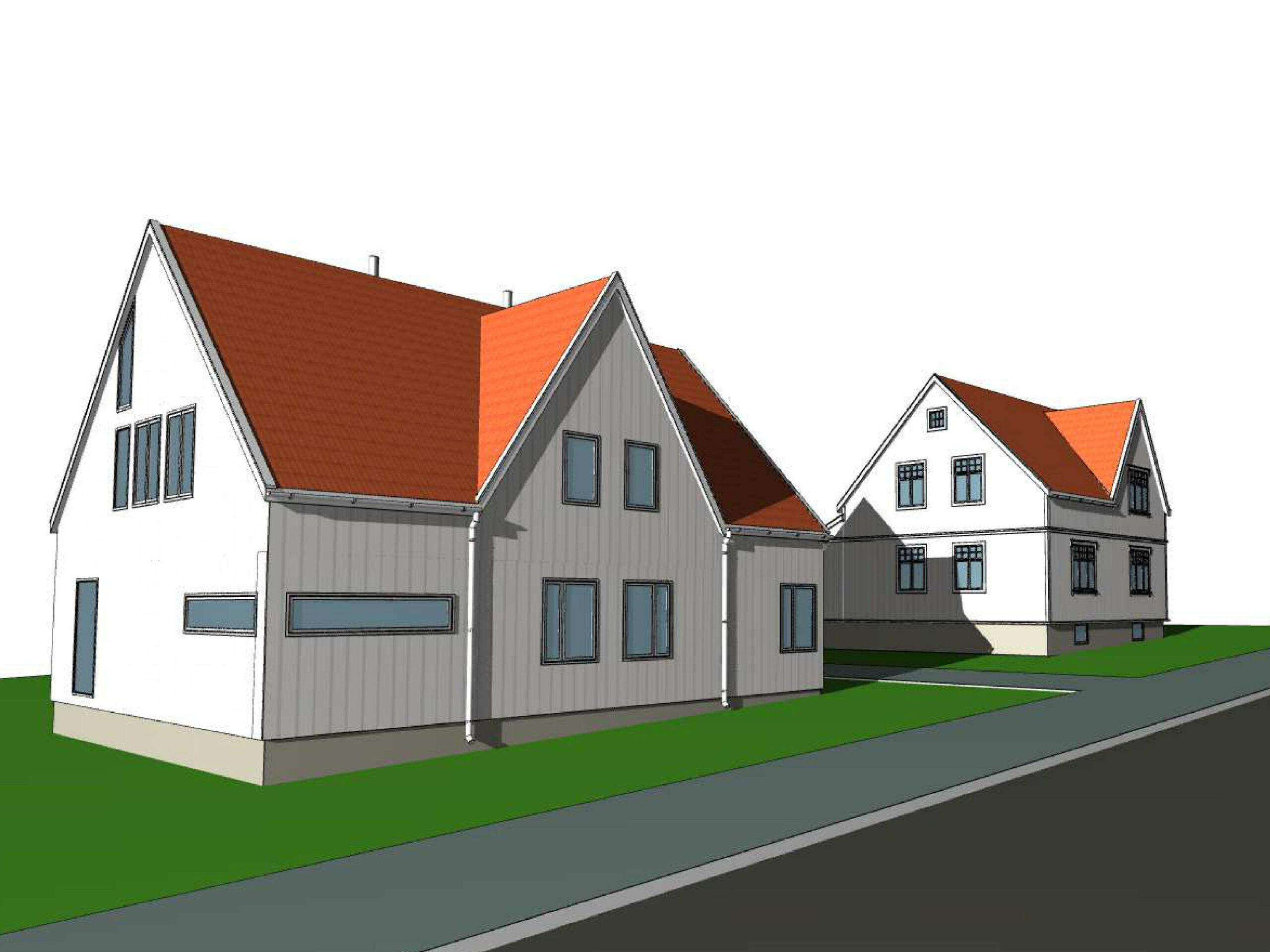 BYGNINGENS UTFORMINGEN MED STORT TAKARK MOT VEIEN ER VALGT FOR Å TILPASSE SEG DEN EKSISTERENDE BOLIGEN. LIK HOVEDFORM MEN MED MODERNE DETALJERINGER.