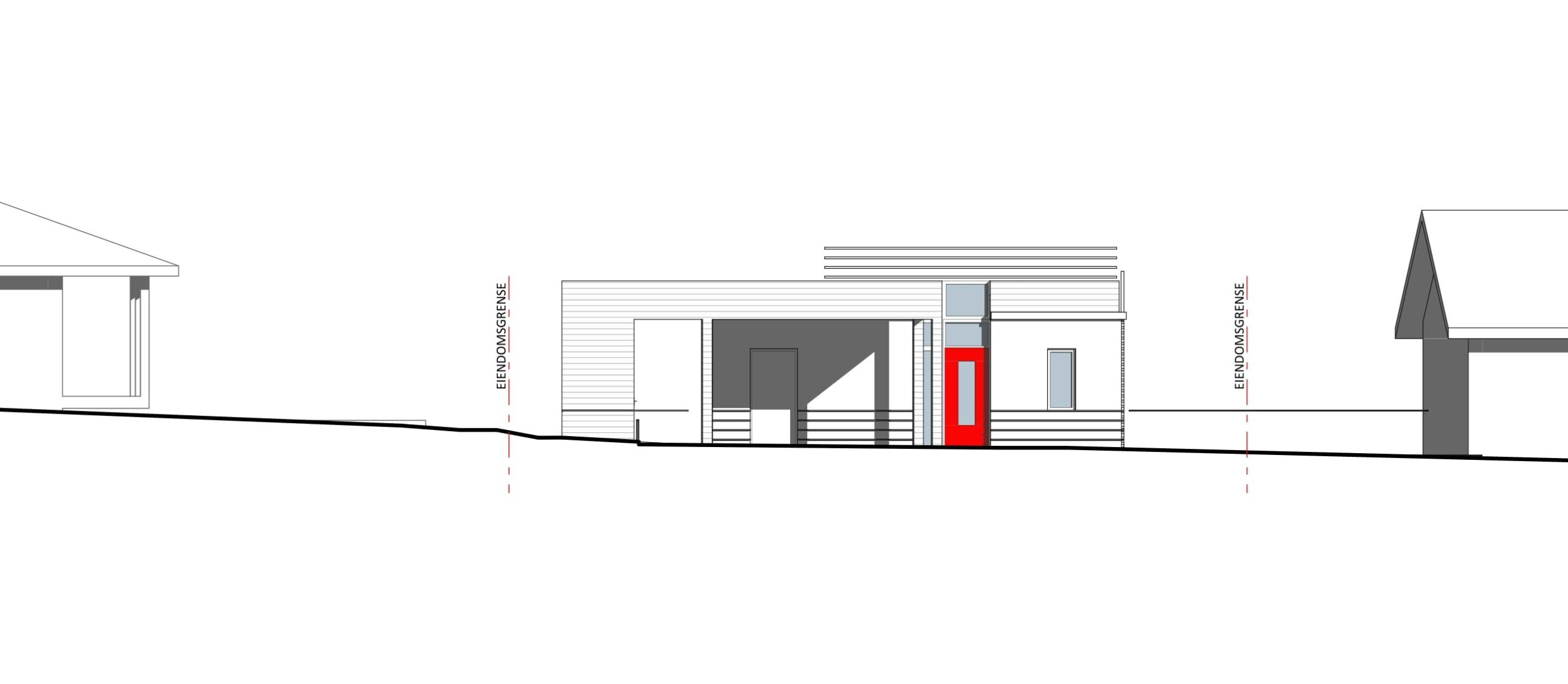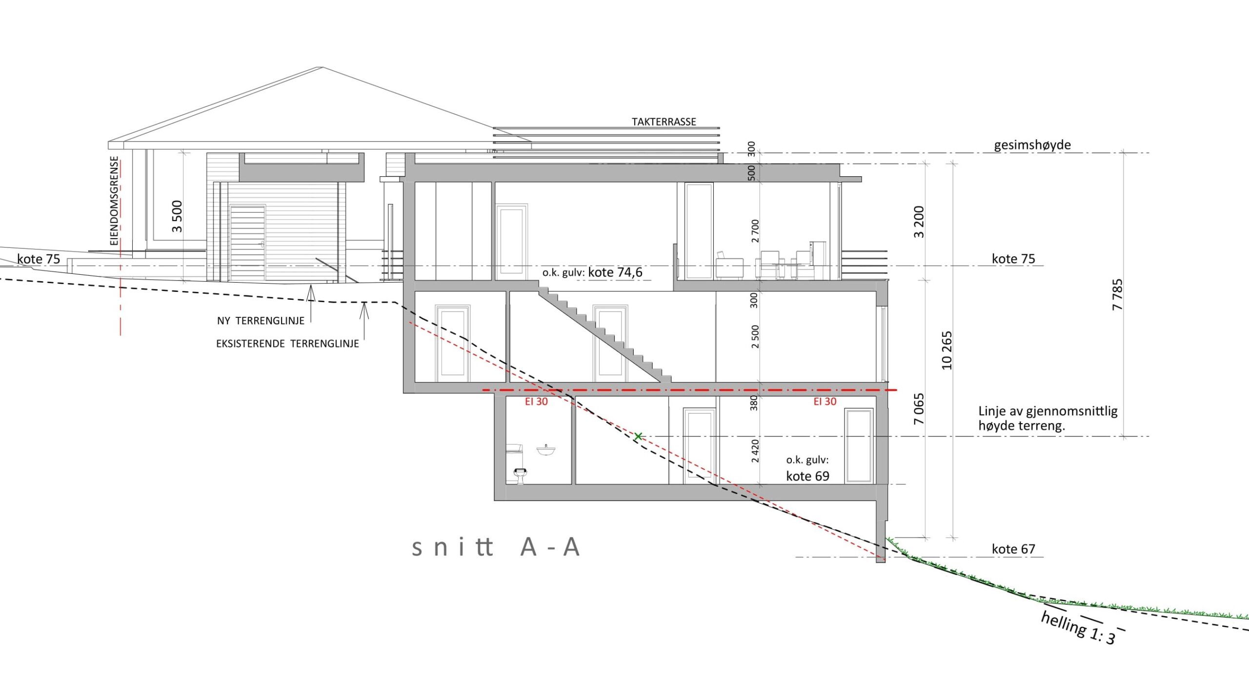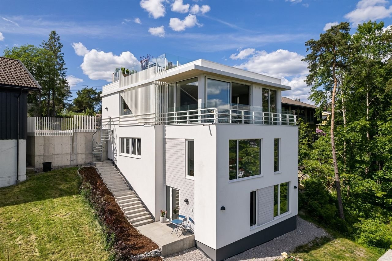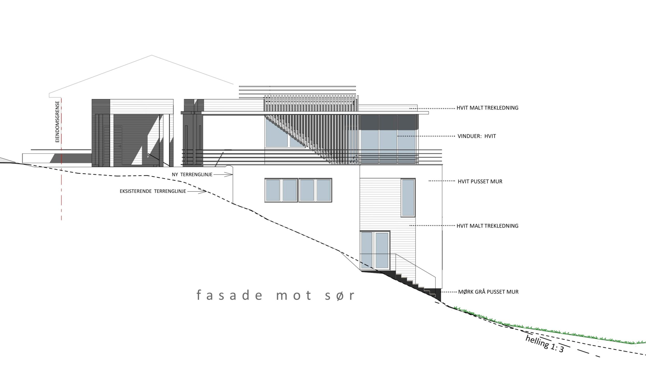 BOLIGENS PLASSERING & UTFORMING FØLGER NATURLIG AV AT TOMTEN ER SMAL OG STERK SKRÅNENDE NEDOVER I BAKKANT.