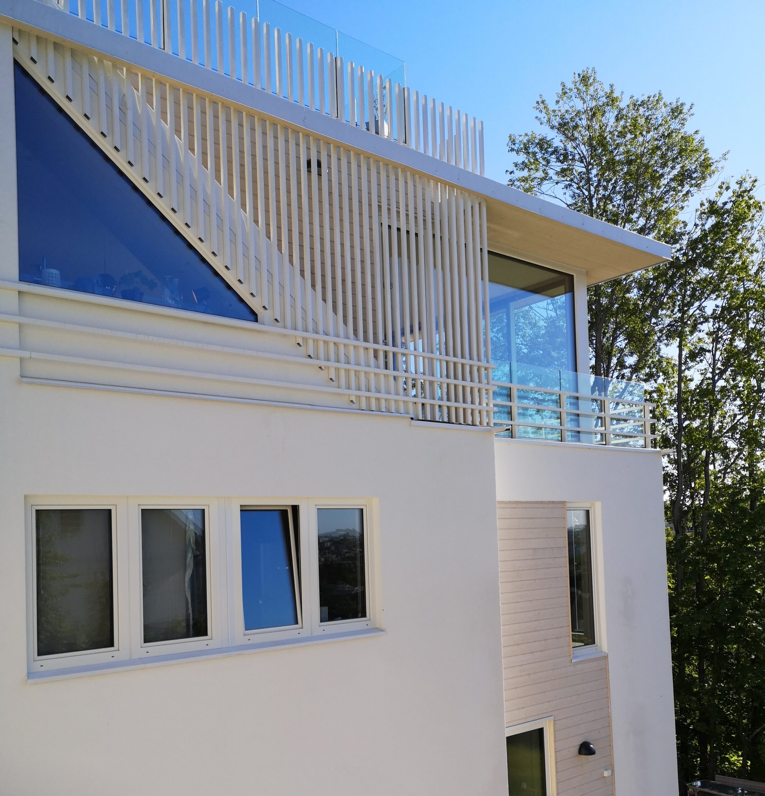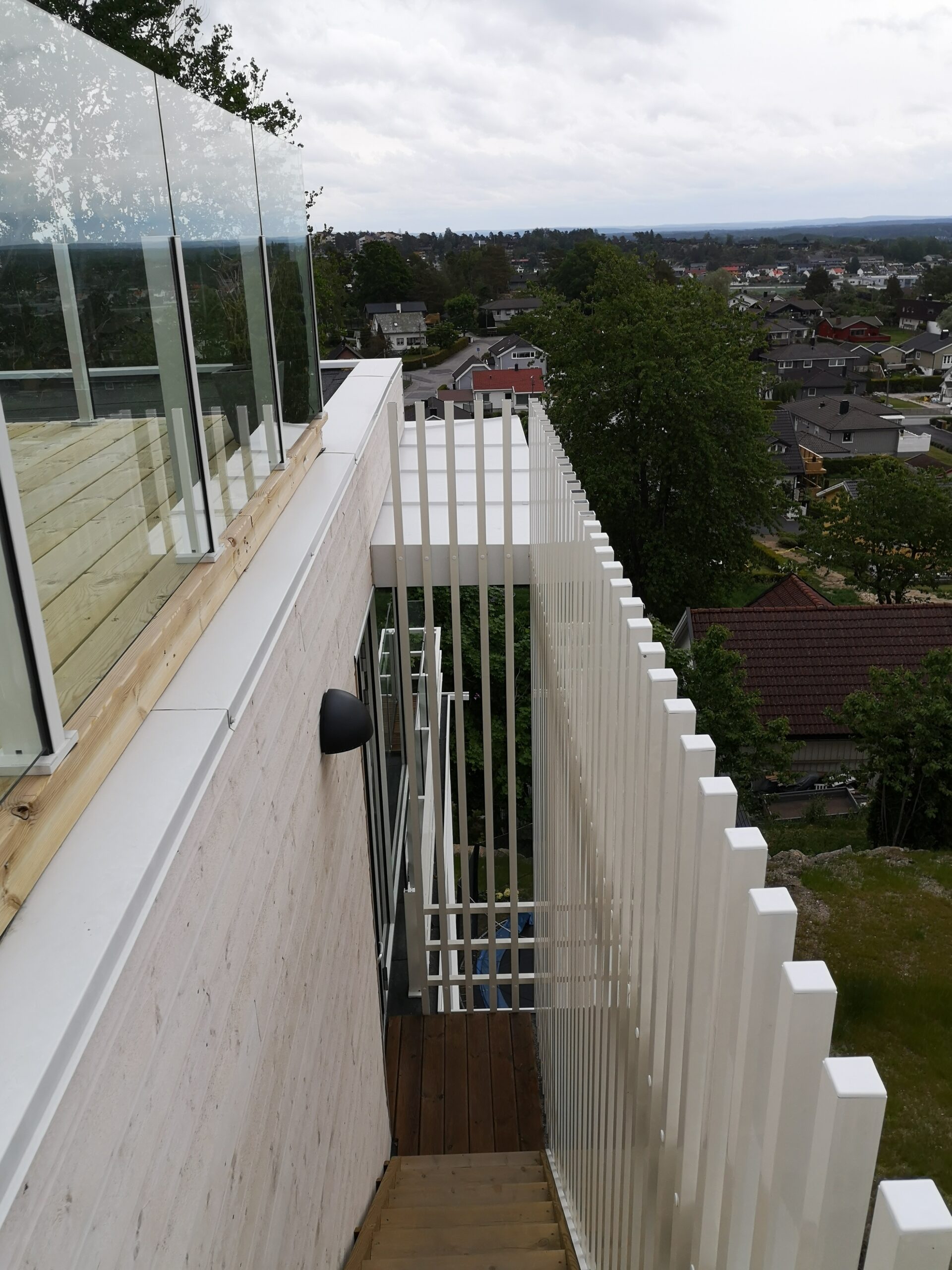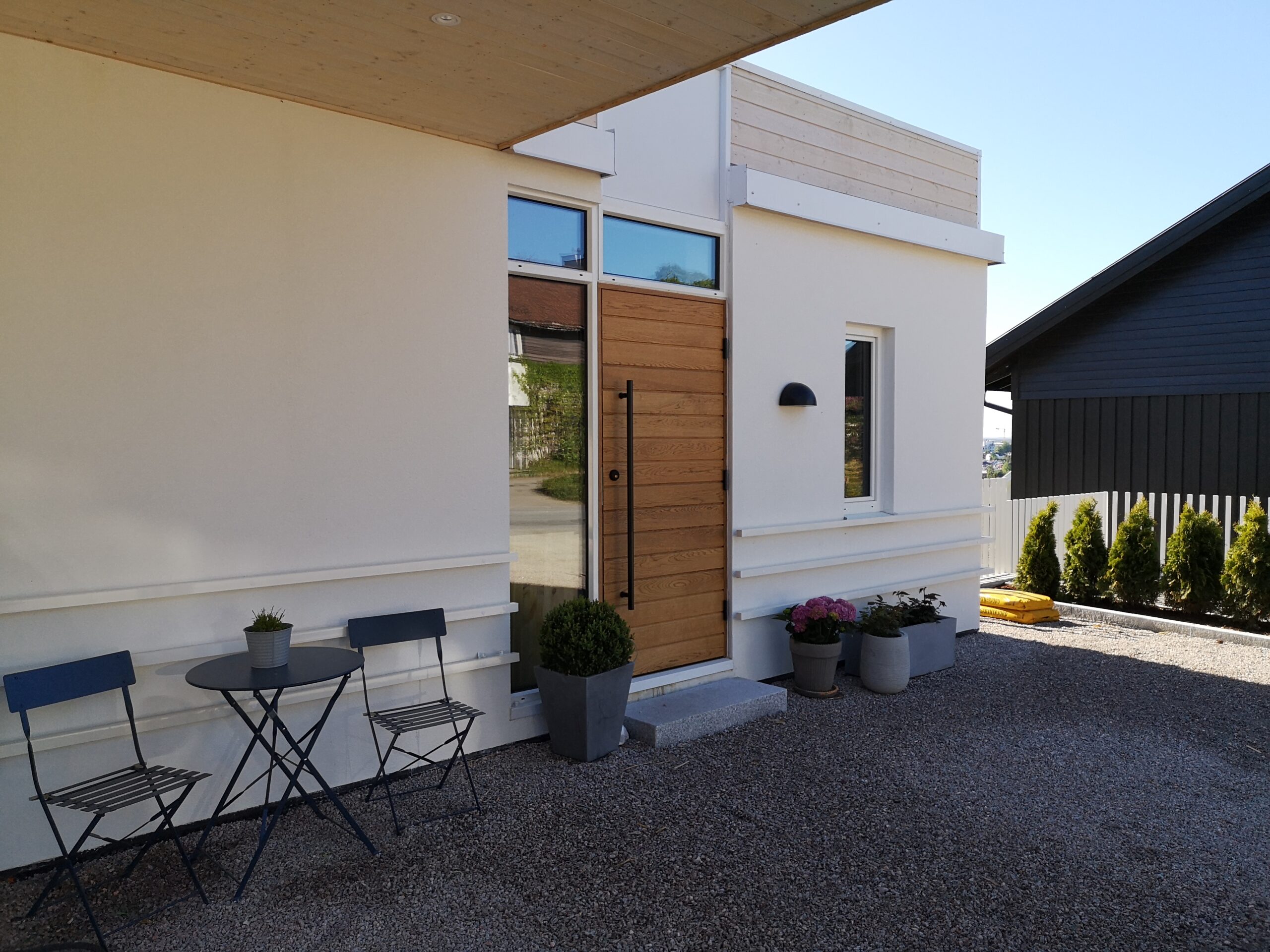 BOLIGENS PLASSERING & UTFORMING FØLGER NATURLIG AV AT TOMTEN ER SMAL OG STERK SKRÅNENDE NEDOVER I BAKKANT.