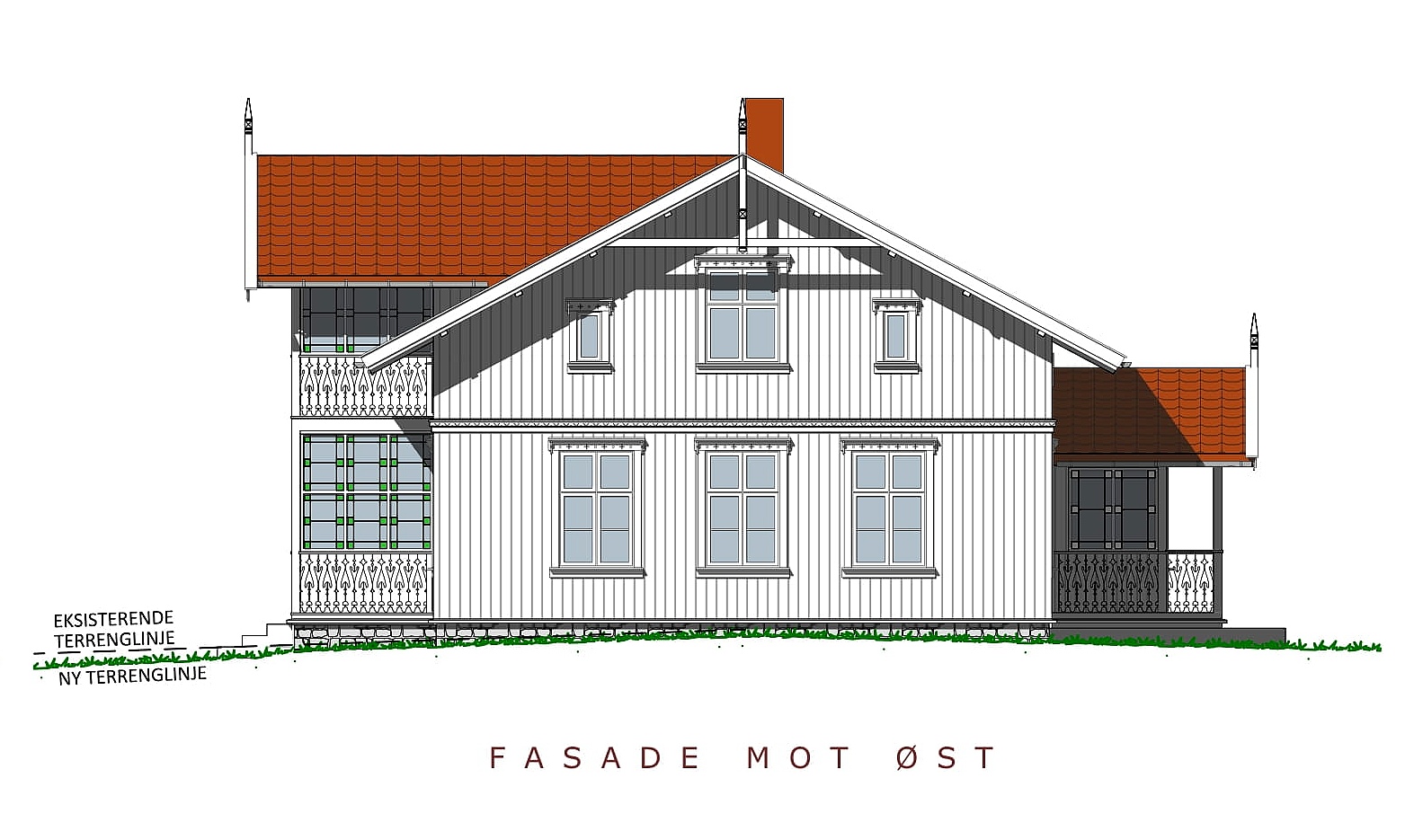 TO NYE TILBYGG I FASADER MOT SØR OG NORD FOR Å ETABLERE VERANDAER OG NYTT INNGANGSPARTI.
